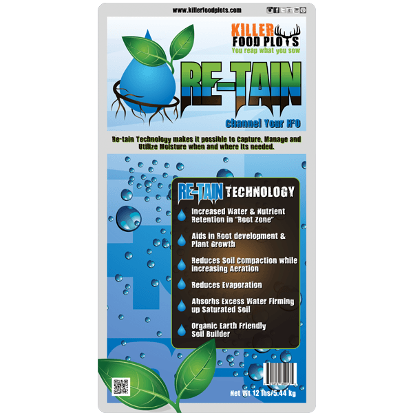 Killer Food Plots RE-TAIN™ is a 100% Organic Pellet that Absorbs H2O & Nutrients Spring-Summer & Fall, Breaks Up Compaction in the Soil, allowing Improved Oxygen Flow to the Plant Roots and then Releases the Moisture & Nutrients back to the Plant at the Root Level whenever the plants need it. This is Especially Important during the Drought Period which is the Best Soil & Air Temps for Growth and also Peak Utilization by Your Whitetails. Killer Food Plots RE-TAIN™ Continues to Secure the Success of Your Food Plots for a Full 3 Years! It’s a No Brainer for anyone planting food plots.